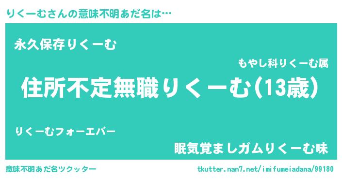 | 女子向けラノベタイトル風あだ名 | 『乙女ゲームの破滅フラグしかない悪役りくーむに転生してしまった…』 |