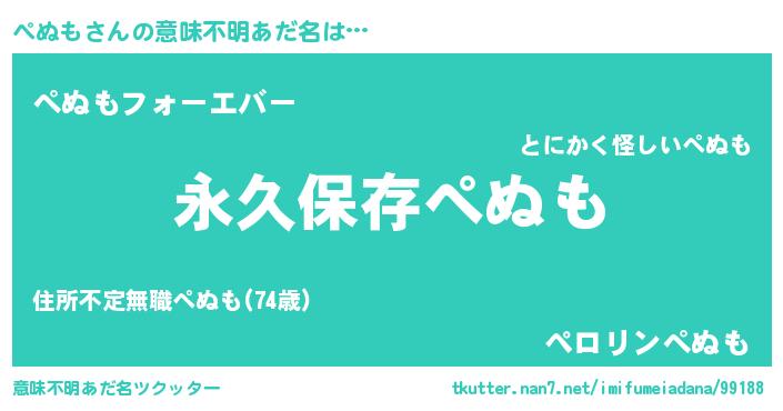 | 男性向けラノベタイトル風あだ名 | 『ぺぬもという概念が存在しない退屈な世界 』 |