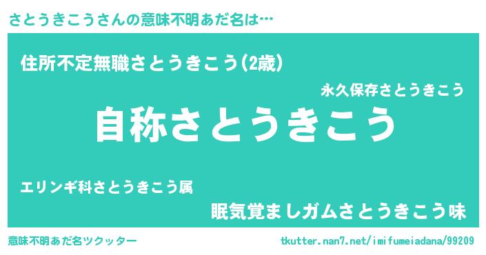 | 男性向けラノベタイトル風あだ名 | 『Re:さとうきこうから始める異世界生活』 |