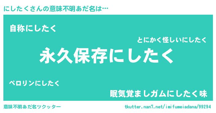 | 男性向けラノベタイトル風あだ名 | 『にしたくという概念が存在しない退屈な世界 』 |