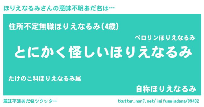 | 男性向けラノベタイトル風あだ名 | 『ほりえなるみの嫁は女の子じゃないと思った?』 |