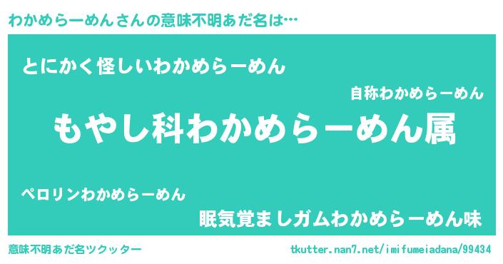 | 男性向けラノベタイトル風あだ名 | 『わかめらーめんに滅ぼされるだけの簡単なお仕事です』 |