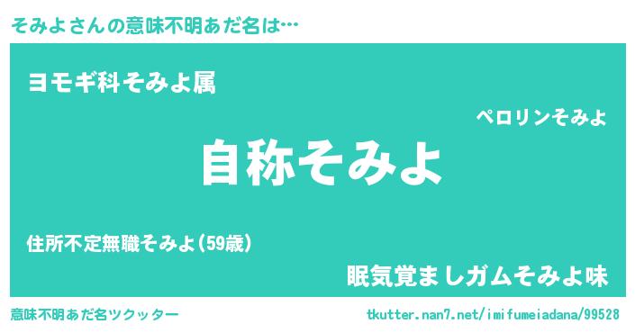 | 男性向けラノベタイトル風あだ名 | 『Re:そみよから始める異世界生活』 |