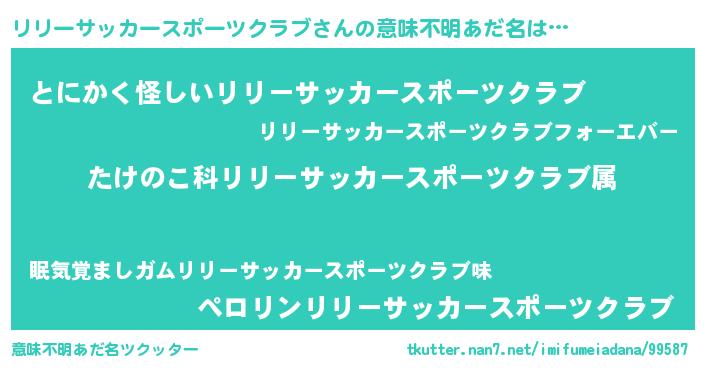 | 男性向けラノベタイトル風あだ名 | 『転生したらリリーサッカースポーツクラブだった件』 |