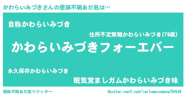 | 胡散臭い通販商品みたいなあだ名 | 『世界が平和になる高級そうな絵画…その名も「かわらいみづき」』 |