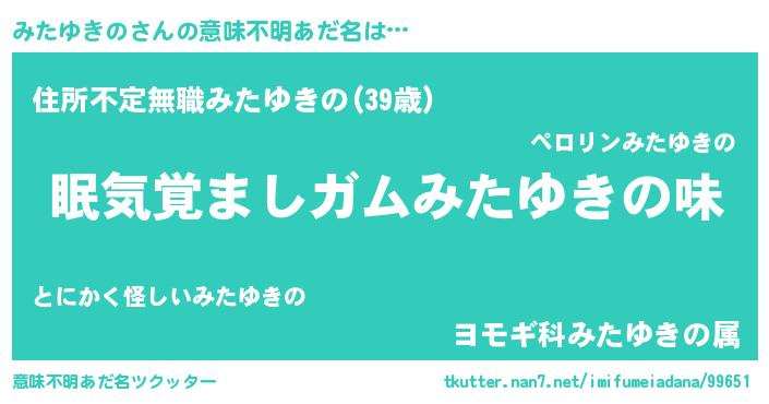 | 男性向けラノベタイトル風あだ名 | 『おまえをオタクにしてやるから、俺をみたゆきのにしてくれ! 』 |