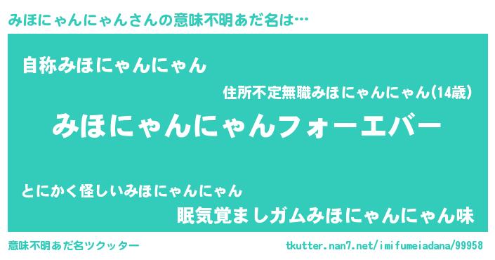 | 欧米人風あだ名 | 『アンジェラ・みほにゃんにゃん』 |