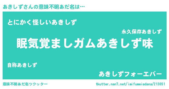 | 男性向けラノベタイトル風あだ名 | 『あきしずに滅ぼされるだけの簡単なお仕事です』 |