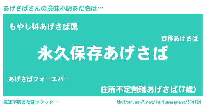 | 男性向けラノベタイトル風あだ名 | 『あげさばという概念が存在しない退屈な世界 』 |