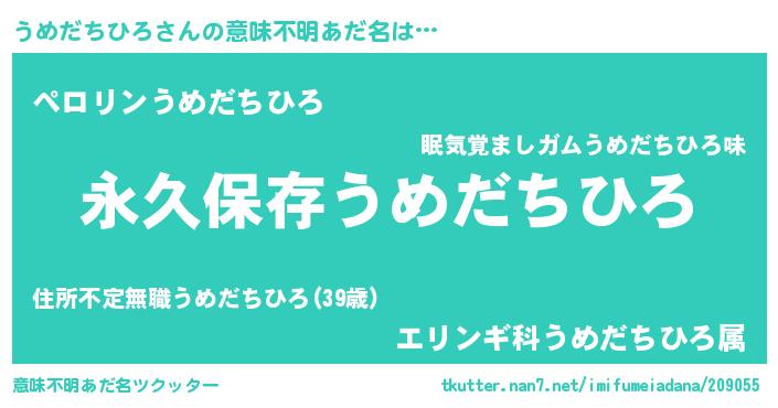 | 胡散臭い通販商品みたいなあだ名 | 『来世でも幸せになれる健康食品…その名も「うめだちひろ」』 |