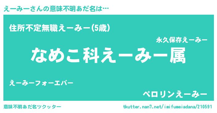 | 男性向けラノベタイトル風あだ名 | 『転生したらえーみーだった件』 |