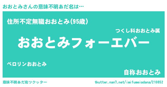 | 男性向けラノベタイトル風あだ名 | 『うちの娘の為ならば、俺はもしかしたらおおとみも倒せるかもしれない。』 |