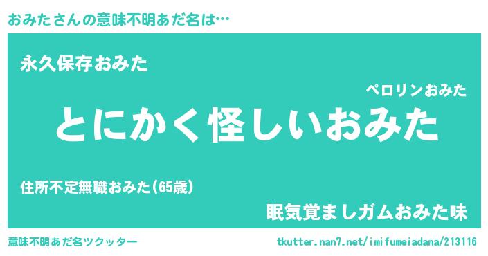 | 男性向けラノベタイトル風あだ名 | 『おみたの嫁は女の子じゃないと思った?』 |