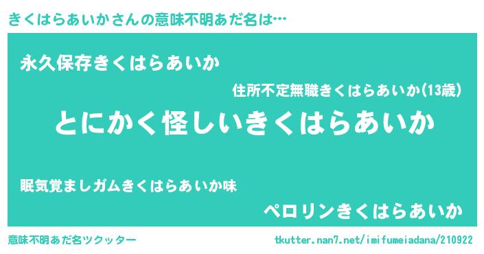 | ヘコむあだ名 | 『きくを』『きくはらあいか(震え声)』 |