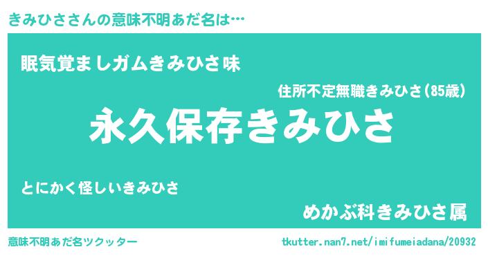 | 女子向けラノベタイトル風あだ名 | 『異世界で失敗しない100のきみひさ』 |