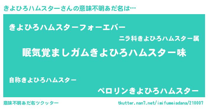 | 男性向けラノベタイトル風あだ名 | 『おまえをオタクにしてやるから、俺をきよひろハムスターにしてくれ! 』 |