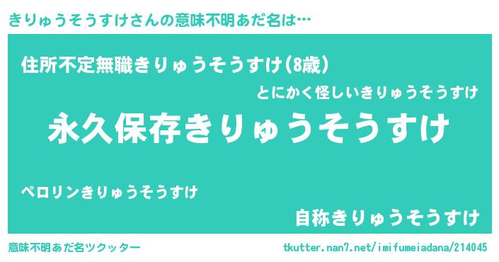 | 男性向けラノベタイトル風あだ名 | 『きりゅうそうすけに滅ぼされるだけの簡単なお仕事です』 |