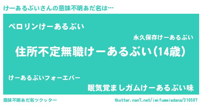 | ヘコむあだ名 | 『けーふぇ~』『けーあるぶい(震え声)』 |