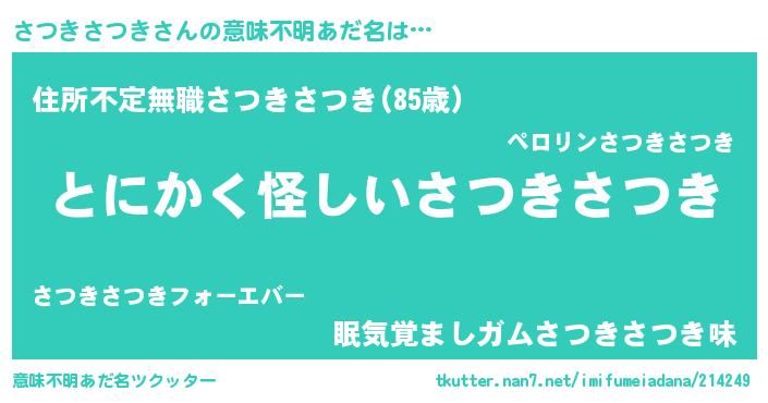 | 男性向けラノベタイトル風あだ名 | 『さつきさつきの嫁は女の子じゃないと思った?』 |