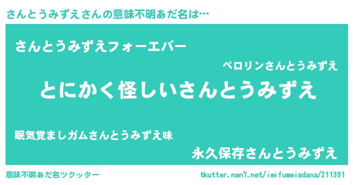 | 男性向けラノベタイトル風あだ名 | 『さんとうみずえの嫁は女の子じゃないと思った?』 |