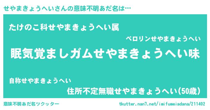 | ヒーロー風カッコイイあだ名 | 『慈愛の使者せやまきょうへい』 |