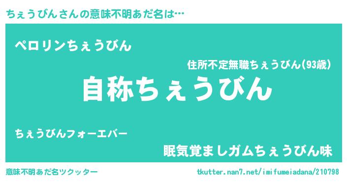 | 女子向けラノベタイトル風あだ名 | 『ちぇうびんなんてお断りですっ。』 |
