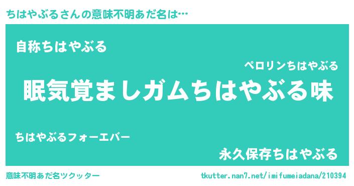 | 男性向けラノベタイトル風あだ名 | 『ちはやぶるに滅ぼされるだけの簡単なお仕事です』 |