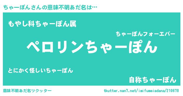 | 男性向けラノベタイトル風あだ名 | 『ちゃーぽんに滅ぼされるだけの簡単なお仕事です』 |