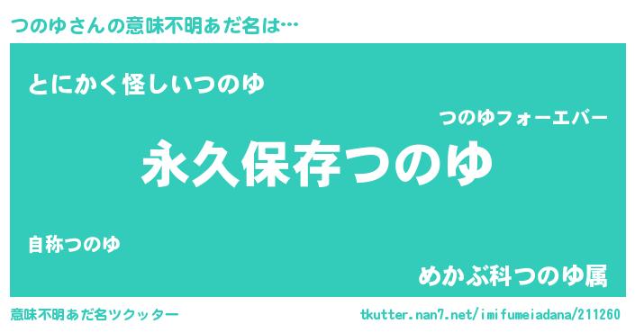 | 男性向けラノベタイトル風あだ名 | 『つのゆという概念が存在しない退屈な世界 』 |