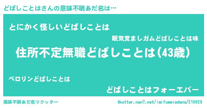 | 女子向けラノベタイトル風あだ名 | 『どばしことはが死なない童話 林檎のどばしことはの診療簿』 |