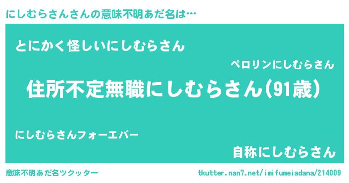 | 男性向けラノベタイトル風あだ名 | 『この素晴らしい世界ににしむらさんを!』 |