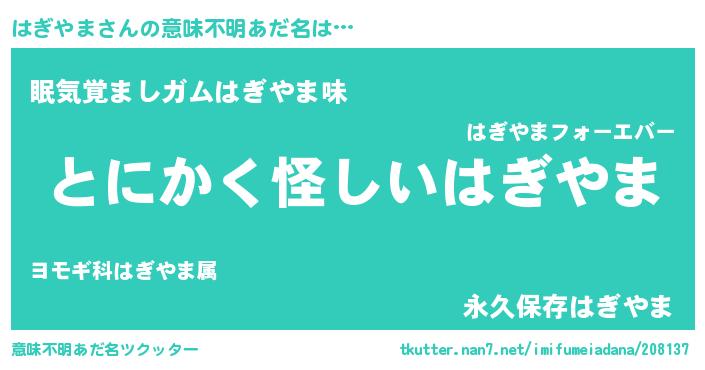 | 男性向けラノベタイトル風あだ名 | 『はぎやまに滅ぼされるだけの簡単なお仕事です』 |