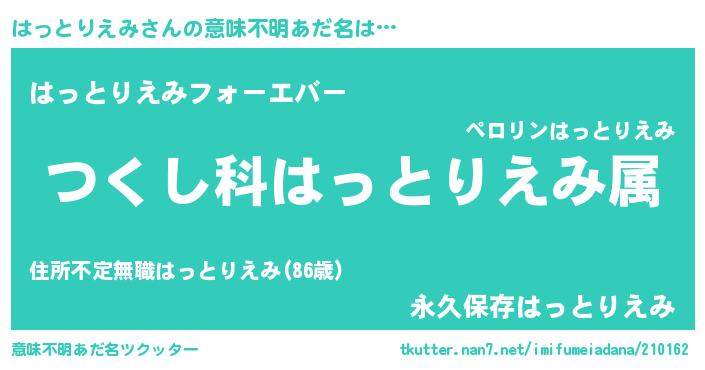 | 男性向けラノベタイトル風あだ名 | 『はっとりえみ~年齢イコール彼女いない歴の魔法使い~』 |