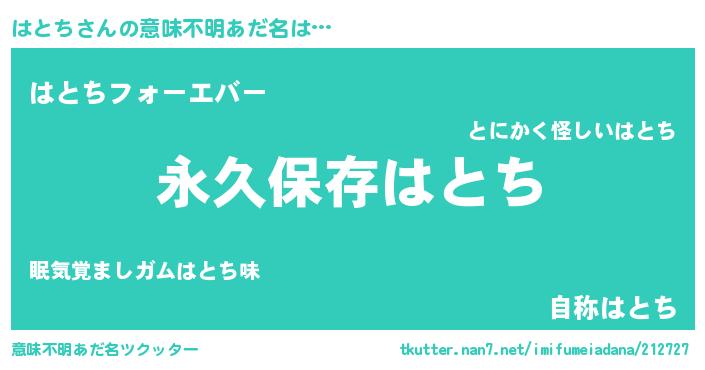 | 男性向けラノベタイトル風あだ名 | 『はとちという概念が存在しない退屈な世界 』 |