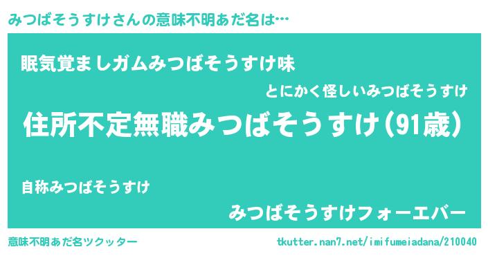 | 男性向けラノベタイトル風あだ名 | 『みつばそうすけに滅ぼされるだけの簡単なお仕事です』 |