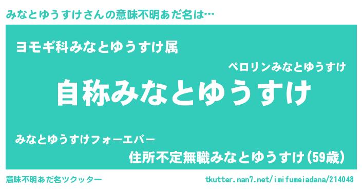 | 男性向けラノベタイトル風あだ名 | 『Re:みなとゆうすけから始める異世界生活』 |