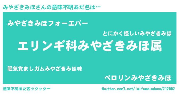 | 男性向けラノベタイトル風あだ名 | 『ミヤザキミホスレイヤー』 |