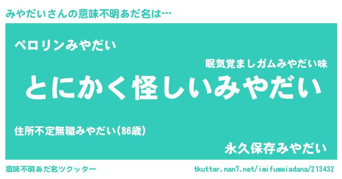 | 男性向けラノベタイトル風あだ名 | 『みやだいの嫁は女の子じゃないと思った?』 |
