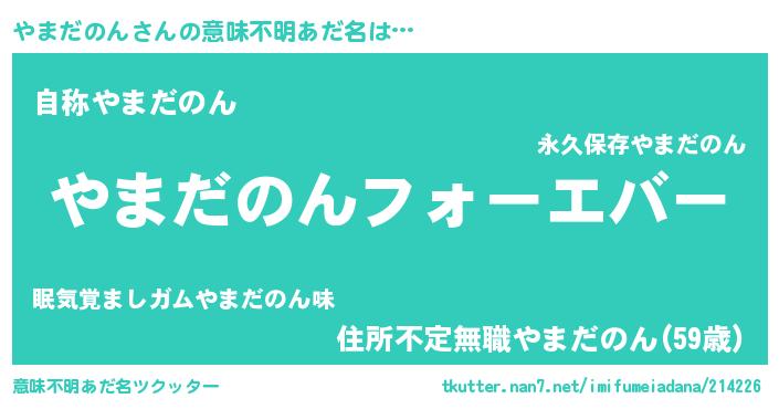 | 男性向けラノベタイトル風あだ名 | 『うちの娘の為ならば、俺はもしかしたらやまだのんも倒せるかもしれない。』 |