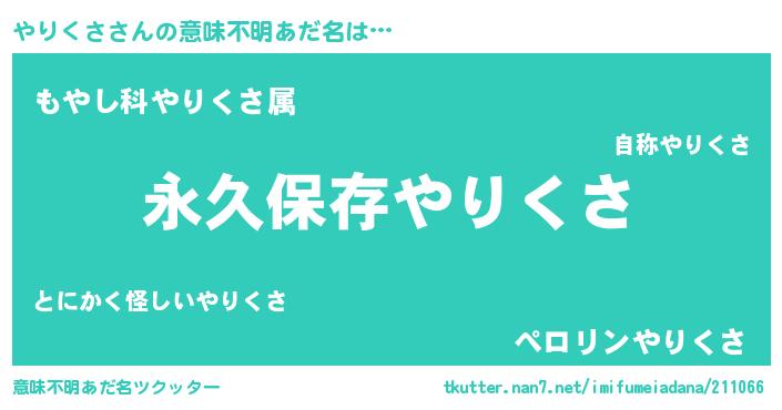 | 男性向けラノベタイトル風あだ名 | 『やりくさという概念が存在しない退屈な世界 』 |