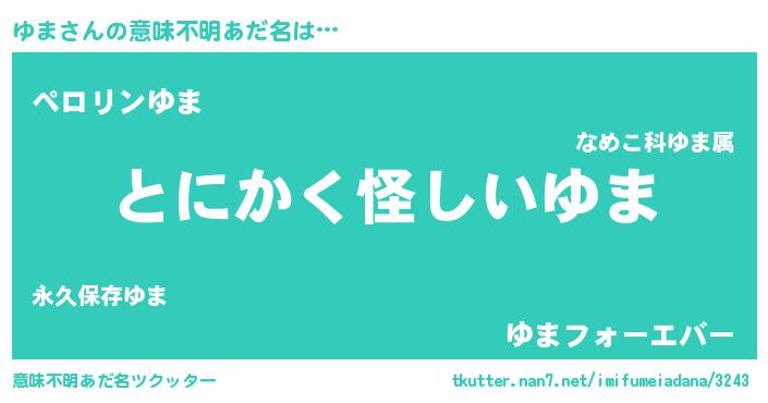 | 胡散臭い通販商品みたいなあだ名 | 『信頼と実績のサプリメント…その名も「ゆま」』 |