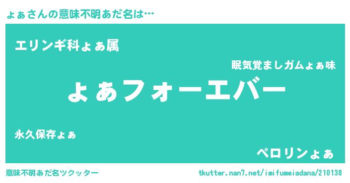 | 自動車の名前っぽいあだ名 | 『ョクア』『ョールスァイス』『ョンR』 |