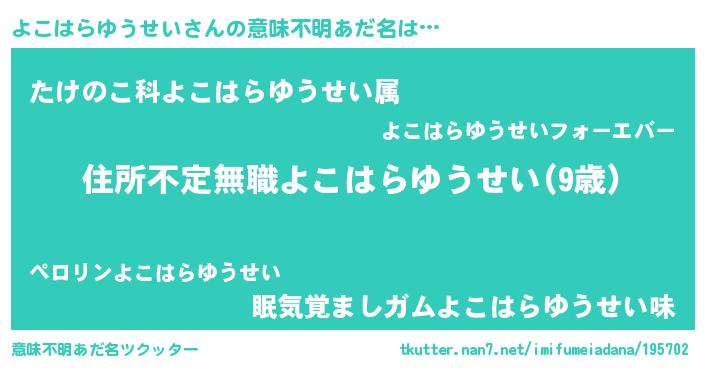 | 料理風あだ名 | 『よこはらゆうせいのカルパッチョ風』 |