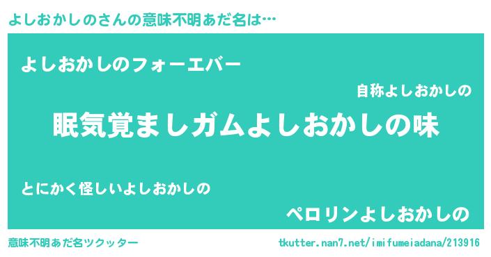 | 男性向けラノベタイトル風あだ名 | 『よしおかしのに滅ぼされるだけの簡単なお仕事です』 |