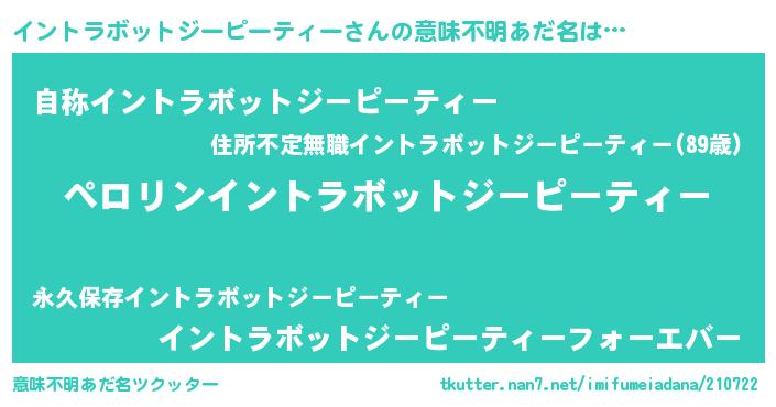 | ヒーロー風カッコイイあだ名 | 『スーパーイントラボットジーピーティー』 |