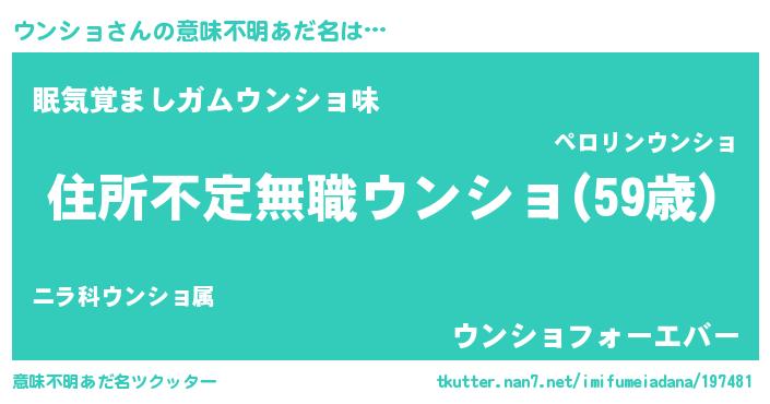 | 男性向けラノベタイトル風あだ名 | 『ウンショに滅ぼされるだけの簡単なお仕事です』 |