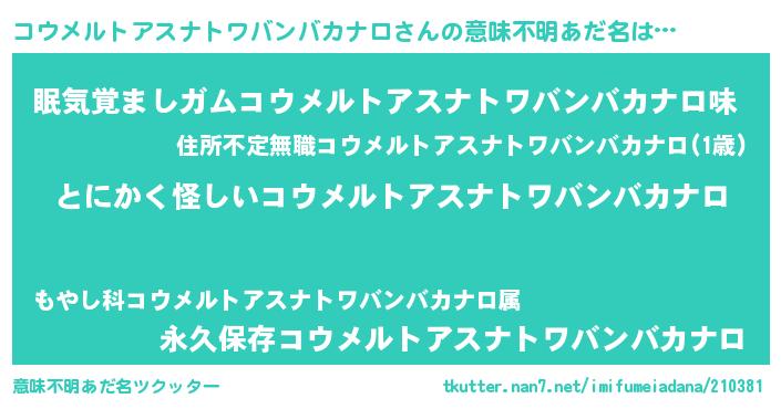 | 男性向けラノベタイトル風あだ名 | 『はたらくコウメルトアスナトワバンバカナロさま!』 |