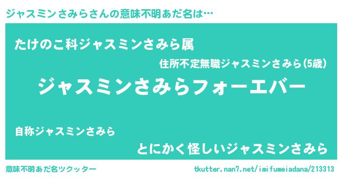 | 男性向けラノベタイトル風あだ名 | 『ジャスミンさみらに滅ぼされるだけの簡単なお仕事です』 |