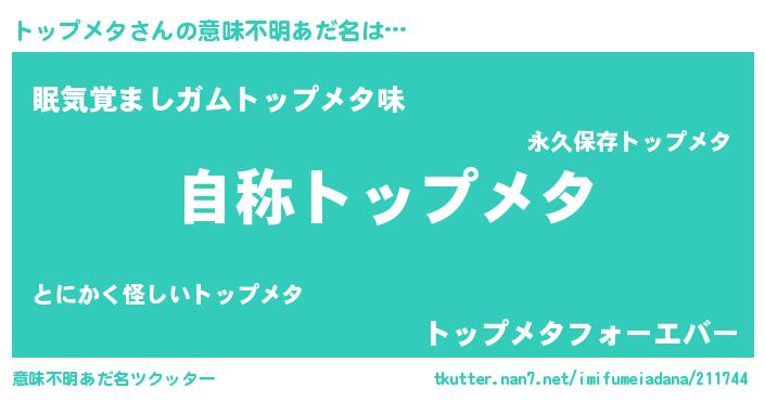 | 男性向けラノベタイトル風あだ名 | 『Re:トップメタから始める異世界生活』 |