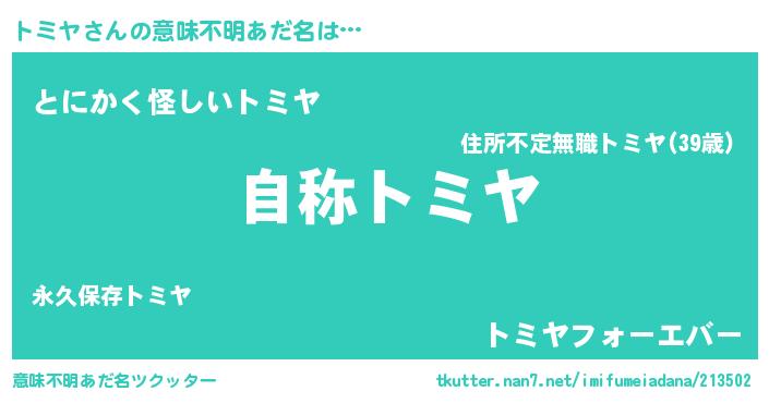| 男性向けラノベタイトル風あだ名 | 『Re:トミヤから始める異世界生活』 |
